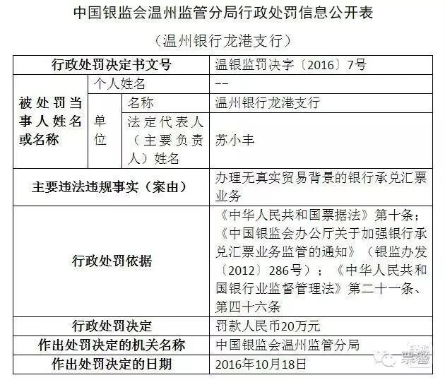 记者从中国银行业监督管理委员会官网获悉,近日,中国银行业监督管理委员会发布“温银监罚决字〔2016〕7号”行政处罚决定书。信息显示,因办理无真实贸易背景的银行承兑汇票业务,温州银行龙港支行被中国银监会温州监管分局处以20万元罚款。 据悉,温州银行龙港支行法定代表人是苏小丰。温州银行龙港支行主要违法违规事实:办理无真实贸易背景的银行承兑汇票业务。中国银监会温州监管分局依据《中华人民共和国票据法》第十条;《中国银监会办公厅关于加强银行承兑汇票业务监管的通知》(银监办发〔2012〕286号);《中华人民共和国银行业监督管理法》第二十一条、第四十六条的相关规定,作出罚款人民币20万元的行政处罚决定。作出处罚决定的日期是2016年10月18日。