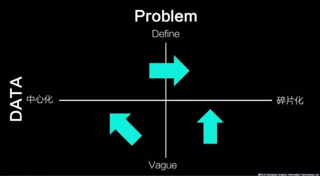 下面这张图中有四个坐标:数据集中、数据分散、问题清楚、问题不清楚。过去我们可以解决的是数据集中、问题很清楚的部分,后来开始出现很多碎片化、分散的数据,我们发现可以用零散的、没有集合、没有结构化的数据,更好地解决原来的问题。