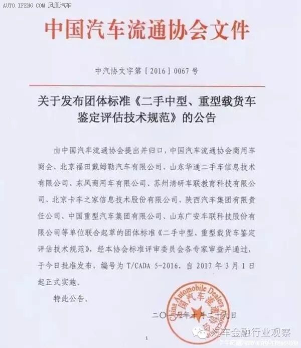 10月29日,中国汽车流通协会团体标准《二手中型、重型载货车鉴定评估规范》,在正在重庆举办的2016中国商用车博览会上正式发布,该规范将于2017年3月1日起开始实施。它的出台,标志着我国千余万辆的商用车市场,拥有了第一部专门的、针对和适用于中型、重型二手商用车的鉴定评估规范,这对于规范市场经营、建立行业信用、保护消费者合法权益等方面均具有重要意义。