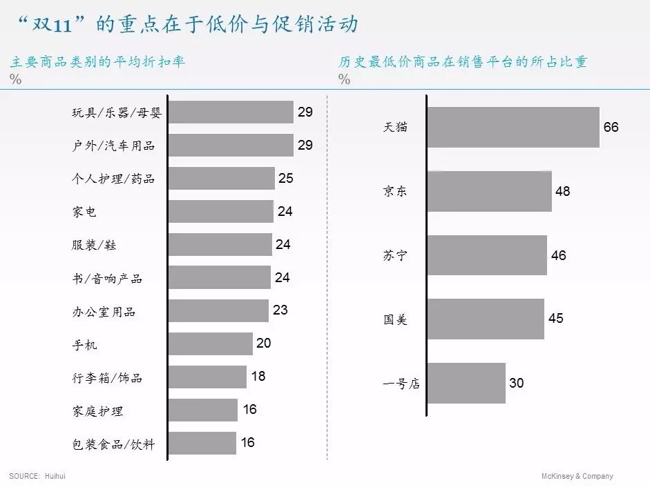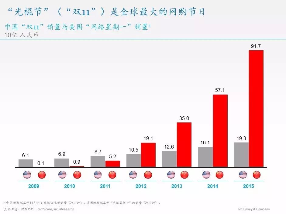 中国消费者一向大受打折促销的吸引,同时也非常愿意(尤其是用手机)尝试网上的新玩意儿。“双11”正好利用了这两点,使消费者能在一天时间内以非常实惠的价格抢购到心仪的商品,而这一切仅需简单操作手机便可轻松完成。事实上,“双11”三分之二的成交量都来自手机移动端。去年“双11”的促销力度非常大。大部分商品的平均折扣都超过了20%,一半的商品打出史上最低价。极具吸引力的价格再加上集中推广的营销活动,助推了“双11”的成交量年年攀升,也使之成为一种全球网购现象。