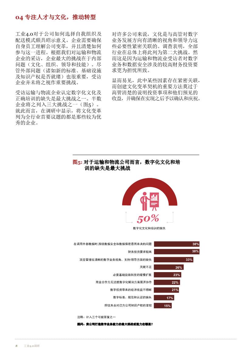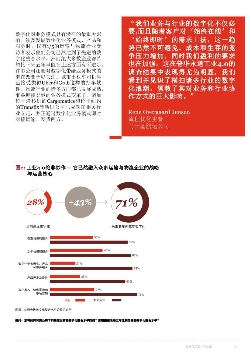 先前围绕工业4.0进行的讨论已由某些人士眼里的炒作转变为投资和真实的成果。据报道,在接下来的五年,整个运输和物流行业拟将年收入的5%投入到数字化运营方案中。对于一个利润微薄的行业而言,该项投入数额重大。该种投资不断转化为越发先进的数字化整合成果。部分(1/4至1/3之间)运输和物流企业认为自身的数字化整合早已达到先进水平,而大约3/4的公司表示五年内就能达到这一水平。