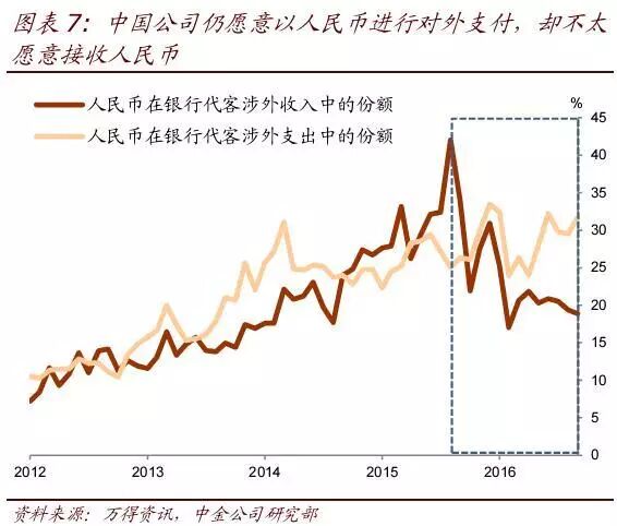 我们认为,在人民币贬值预期挥之不去而在岸外汇管理趋严的情况下,人民币流出可能已成为规避外汇管理、实现资本跨境并最终转为外汇资产的重要渠道。在过去一年间,人民币在银行代客涉外支出中的份额继续攀升,而在涉外收入中的份额却大幅下降。这种分离在历史数据中并不多见。如果没有理由认为境外市场参与者在人民币贬值预期下更愿意接收人民币,那么这可能是资本漏出的一个间接印证(图表7)。