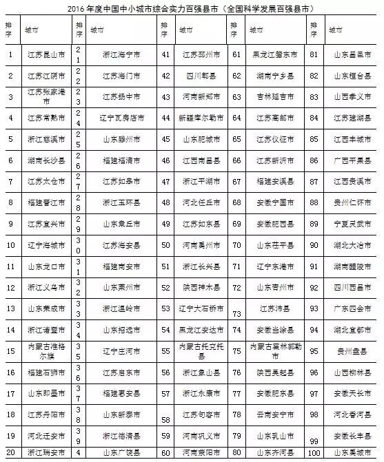 日前,中小城市经济发展委员会、中小城市发展战略研究院、中国中小城市科学发展指数研究课题组等单位通过《人民日报》和《2016中国中小城市发展报告·绿皮书》联合发布了第十二届中国中小城市科学发展指数研究成果暨“2016全国综合实力百强县市”、“2016全国综合实力百强区、“2016综合实力千强镇强”等榜单。