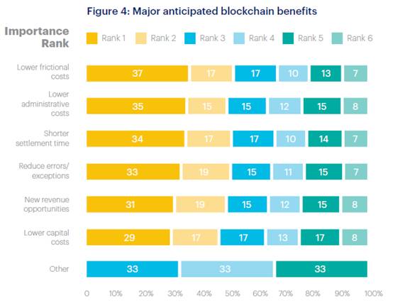 而关于区块链可能带来的好处,更低的交易成本是受访银行认为是排在第一位的,其后是更低的管理成本、更短的结算时间、更少的错误、新的创收机会和更低的资本成本(详见下图)。