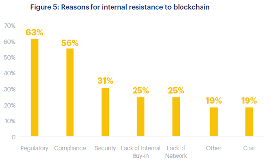 在上述埃森哲的文章《区块链:银行如何构建全球实时支付网络》所调研的34家银行中,63%的银行认为监管因素是银行内部阻碍应用区块链技术的因素,56%的认为是合规因素,其后的几个因素是安全、缺少内部资金支持、缺少网络和成本问题(详见下图)。