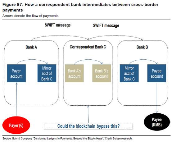 瑞信8月报告《区块链:信任颠覆者(Blockchain:The Trust Disrupter)》称"跨境支付可能是分布式账本技术最有落地可能的应用。"