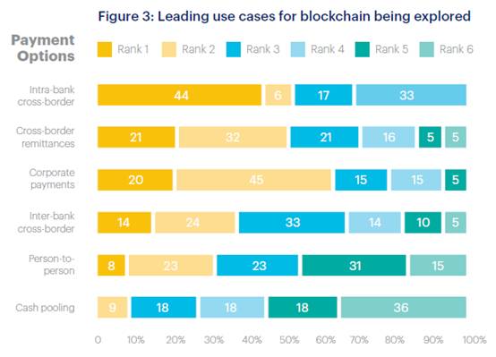 在利用区块链进行跨境支付的各种场景中,企业间的跨境支付是最受欢迎的,有45%的受访银行将其列为第一选择,其后是银行内的跨境支付、现金总库、非本行内的银行间跨境支付、跨境汇款和个人间的跨境支付(详见下图)。