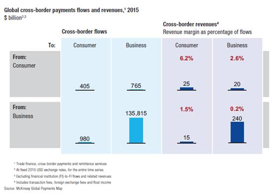 根据麦肯锡报告《2016全球支付:尽管时局动荡,基石强劲不变(Global Payments 2016: Strong Fundamentals Despite Uncertain Times)》,跨境支付交易量(payments volume)占不到全球支付的20%,但是它所带来的交易费占到了全球支付交易费的40%,2015年跨境支付的收入规模为3000亿美元。 在跨境支付收入的构成上,92%是B2B支付,而B2B支付中有90%是通过银行进行的。B2B跨境支付每笔规模约为15000美元到20000美元之间,每笔需缴纳的费用在30美元到40美元之间。