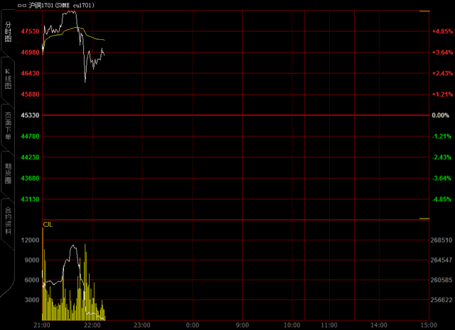 但很快市场出现一波急跌。铁矿石出现大量抛单,沪铜打开涨停快速下挫,目前涨幅已缩窄3.7%。