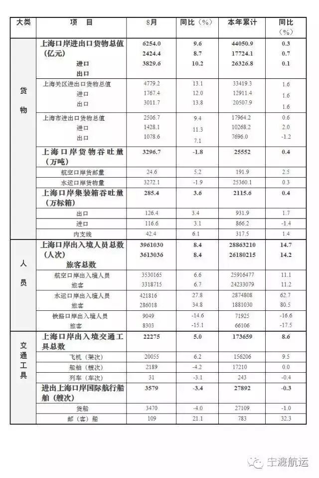 2016年8月份上海口岸主要数据统计备注:①本月上海口岸进出口货物总值占全国进出口货物总值(21959.9亿元)的28.5%。②本月上海水运口岸货物吞吐量占