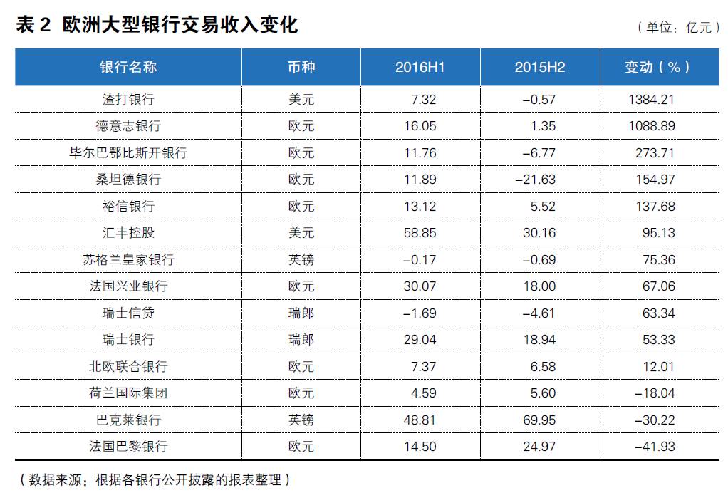 受以上因素影响,2016年上半年欧洲大型银行交易收入大幅增加,其中3家银行实现扭亏为盈,8家银行环比上升,详见表2。