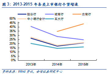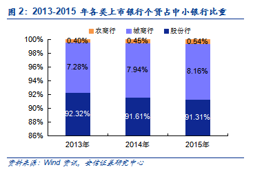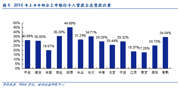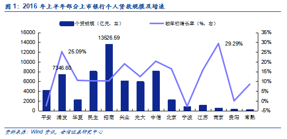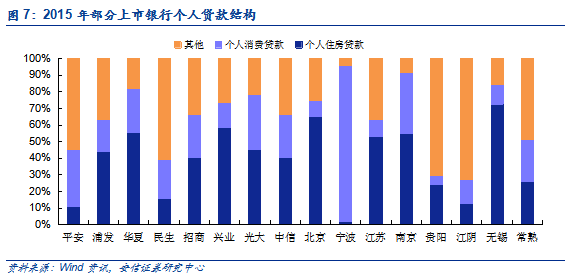 招商零售称王,浦发潜力大。根据已披露的公司中报,除了平安银行和宁波银行今年上半年个人贷款规模较年初出现负增长、贵阳银行基本与年初持平之外,其余上市中小银行的个人贷款均保持较高的增速。其中,上半年增速最快的是南京银行,这与其开始重视零售业务和偏低的基数有关;其次是目标“做大零售和小微”的浦发银行,在超7000亿的个贷规模下仍较年初有25.09%的增长,体现了较强的增长潜力。上半年规模最大的仍是素有“零售之王”招商银行,个人贷款规模突破1.35万亿元,超过排名第二的中信银行0.55万亿元。股份行规模庞大,小银行快速发展。按类型来看,股份制银行的个人贷款规模占中小银行总额的90%以上,处于绝对优势地位,近三年也维持20%左右的较高速增长。相比于布局全国、体量庞大且业务齐全的股份制银行,农商行和城商行借助地缘优势发展零售业务并取得了一定成效,增速相对其他类型银行更快(主要是基数效应),占比也逐年提升。个贷占比股份行突出,城商行和农商行具增长潜力。从半年报数据来看,个人贷款占总贷款比重以招商银行表现最为突出,截至上半年已有44.69%的贷款流向个人客户;平安、浦发、民生、兴业、光大等股份制银行个贷占比均超过30%。上市城商行中宁波银行个贷占比接近30%,其余偏低。常熟农商行是少数较为重视零售业务的农商行,个贷占比也达到34.04%。按类型来看,2015年上市股份行平均个贷占比达到32.08%,既是上市中小银行最高水平,也高于五大行平均的30.71%。城商行和农商行个贷占比偏低,主要是因为这两类银行在以往更多服务于地方企业和政府项目,对零售业务发展不够重视,但考虑到这两类银行在地区具备网点优势和较强的客户粘性,未来个贷占比有望继续提升。中小银行个贷结构各异。2015年末五大行住房贷款占比达到72.9%,几乎是中小银行平均住房贷款占比的2倍;中小银行个贷结构相对均衡,个人消费贷款和以经营性贷款为主的其他类贷款占比分别达到25.34%和36.26%。股份行个贷结构整体均衡,但个体差异较大,例如兴业银行住房贷款占比达到58.27%,平安银行仅有10.75%。农商行由于要担负帮扶当地“个体户”的责任,经营性贷款占比偏高。城商行更重视住房贷款,与当地快速上涨的房价相对应。北京和南京楼市较热,对应北京银行、江苏银行和南京银行的住房贷款占比均超过40%;宁波银行则独树一帜地以个人消费贷款为主,占比高达94.23%。