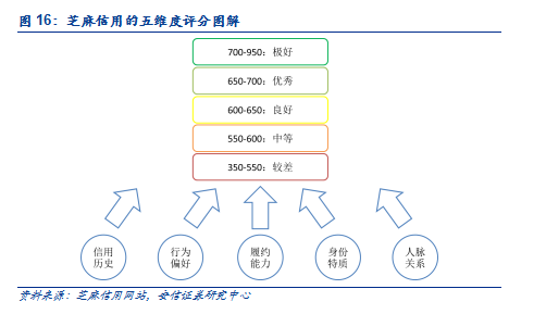 互联网征信的范例:芝麻积分。以芝麻信用为例,在用户授权后通过采集方方面面的数据,通过云计算、机器学习等,根据信用历史,结合身份特质、履约能力、行为偏好和人脉关系,芝麻信用可以从五个维度立体地刻画个人信用全貌的模型,并给与相应的信用评分。商户和金融机构可以参考芝麻分做出更精准、更快速的决策,从而更好地提供服务。用户通过日常生活和经济活动中尽可能使用信用服务并及时履约,就可以提升自己的信用等级,从而获取相对应的服务。目前,通过与芝麻信用的合作,包括拍拍贷、广发银行在内的金融机构,总计发放贷款约280 亿元。