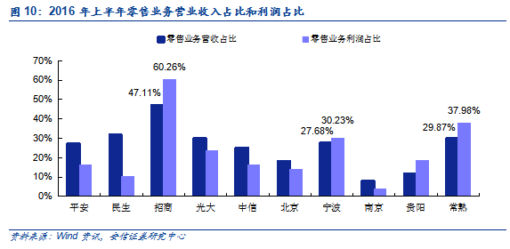 招商零售盈利贡献最高,多家银行经营效率仍需提升。2016年上半年,招商银行零售业务营业收入占比达到47.11%,利润贡献更是达到60.26%,充分体现了零售业务对其的重要性。平安、民生、光大和中信等股份行零售业务收入占比均超过25%,但利润贡献仍偏低,表明其零售业务的经营效率仍需提升。宁波银行和常熟农商行零售业务利润占比也突破30%,在零售业务发展上较其他城商行和农商行更为领先。个贷不良整体优于对公。从部分中小银行披露的数据来看,个人贷款的资产质量整体优于对公贷款。招商银行对公不良率达到2.28%,但个人贷款不良率只有1.07%,降低了银行整体的不良风险。
