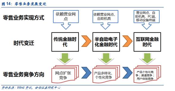 需警惕楼市泡沫风险。目前,受市场环境的影响,个人经营性贷款的不良率偏高,消费贷款不良率也在逐年上升;由于房价还维持着上涨的趋势,上市中小银行住房贷款不良率维持在0.5%以下,但随着房价已升至相对高位和楼市调控预期升温,住房贷款存在一定风险隐忧,值得警惕。第一阶段是传统金融时代。全球银行零售业务的发展基本经历了三个主要的阶段,最初各国经济还处于发展的“萌芽阶段”,银行和客户对于银行零售业务的理解主要在于简单的存贷款业务。在这一阶段中,零售业务主要围绕着银行网点进行的现金业务,各个银行总体上提供“同质化”的服务,银行间的竞争主要在于网点的扩张以满足客户对于便捷性的需求。