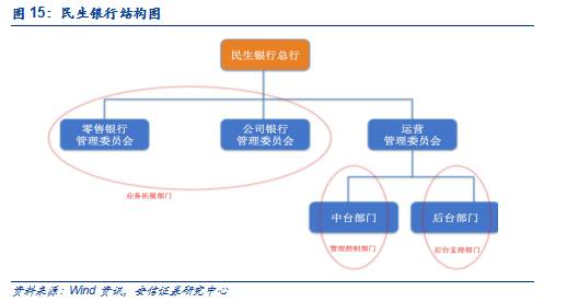 兴业银行:业务条线+分行块状。兴业银行在条线改革过程中就有意减少对分行原有职能的削弱。具体来说,兴业银行采取的是业务条线与分行的块状结构相结合,即条块结合的方式。三大条线为企业金融条线,零售银行条线和兴业银行具有特殊优势的金融市场条线。与民生银行事业部制直接将一些行业收归事业部管理、独立于分行不同,兴业银行分行的条线改革仍然基于分行的总体框架内进行。