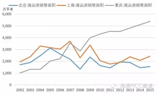 北京、上海实行了严格的控制土地供给规模政策,而重庆则没有限制土地供给,导致北京、上海2010年以来房地产销售面积维持低位,而重庆房地产销售面积则持续上行。