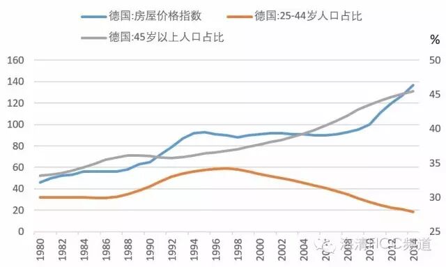 最后看德国,老龄化最严重时期反而是房价上涨最快时期。德国1980年之后人口老龄化一直在持续,1995年适龄购房人口占比见顶、之后长达二十年下降,但在人口老龄化程度最高、适龄购房人口占比最低的2010年以来,德国房价却一路飙升。