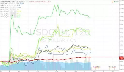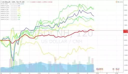 ▲主要发达国家(7大主货币对)货币走势。红色的是人民币走势,所有货币对向上是对美元贬值,向下是升值