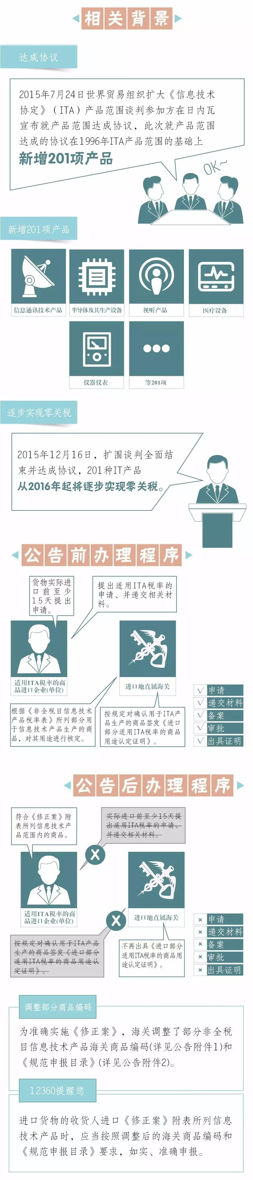 2016年9月14日,海关总署发布了2016年50号公告,主要内容是经国务院审核同意,并于2016年9月3日经第十二届全国人民代表大会常务委员会第二十二次会议决定批准,自2016年9月15日起,对进口《中华人民共和国加入世界贸易组织关税减让表修正案》(以下简称《修正案》)附表所列信息技术产品最惠国税率实施首次降税(具体内容见财政部网站)。此外,公告还明确了海关不再出具《进口部分适用ITA税率的商品用途认定证明》。