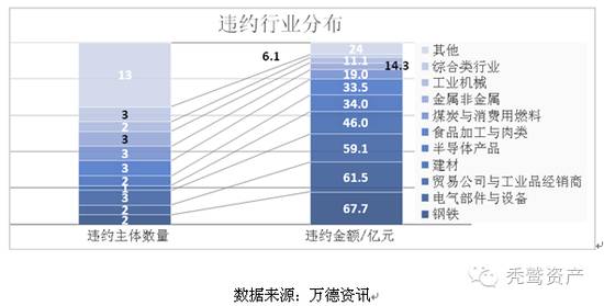 从企业性质来看,在所有37家违约主体中,民营企业占比最大,一共21家;其次为地方国企5家;再次为央企4家。而其他类型的企业其股东背景与民营企业相似。从违约金额来看,地方国企(126.7亿元)和央企(96亿元)占据份额最高,这主要与央企和国企规模大有关。相比其他发债主体,企业信誉度较高,资金筹措来源广,故发债金额相对较大。