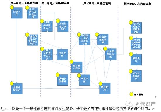 冰冻三尺非一日之寒,在对近年债券违约数据进行挖掘和对违约个案进行总结分析的基础上,我们发现:大多数情况下,债券主体的违约,是一系列信用风险事件按照一定的发展规律层层递进演变积累之后出现的最终结果。我们总结了违约事件从萌芽到最终发生的过程中所经历的发展链条,分四个阶段:风险萌芽期、风险积蓄期、风险显现期和风险应急处置期。