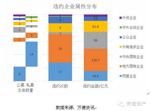 3、性质:民营企业偏多但违约金额较小,国企、央企金额高。