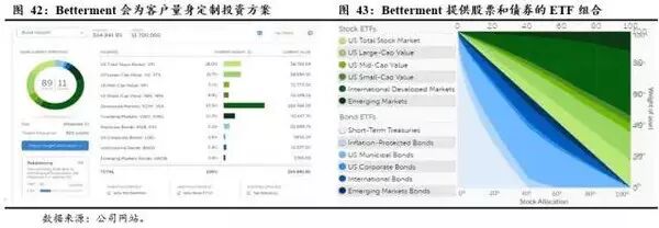 Betterment有较好的界面体验感。用户进入Betterment网站后,填写一些个人信息(年龄、收入、投资目的、期限、目标金额、风险偏好等)后,网站会根据个人状况推荐最适合你的投资建议。这种模式的原理是最基础的 Markowitz 资产组合理论和其衍生模型,在云端低成本、快速、批量化地解决各种数据运算,再根据用户的倾向,个性化地提供资产配置组合方案。这是传统人工理财服务无法比拟的,它可以很多人足不出户就可以享受低门槛、低成本地管理自己的资产。