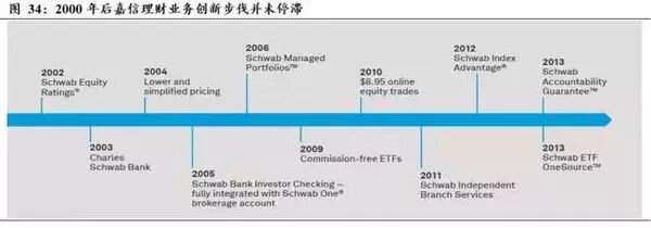1982年,美国国会通过了允许个人退休账户出台的条例,当时最乐观的估计是10年内个人退休账户吸引500亿美元,但实际金额是7250亿美元,远超过市场预期。尽管个人退休账户是一种特殊的产品,但银行业内人士仍把个人退休账户仅仅当成一种普通账户看待,对客户开立和维持个人退休账户收年费,相关产品费用高昂。1986年嘉信公司开始直接取消对个人退休账户收取年费,这使得嘉信的个人退休账户大量增加,超过公司最乐观的预测。通过对账户实现免费,公司实现了个人账户的集聚,这为之后构建资管平台,建立“理财产品超市”提供了基础。公司于1992年推出了共同基金“一账通业务”(One Source)业务,该账户集合了多家资产管理机构产品,对客户免费,但对资产管理机构收入约30BP的管理费用。