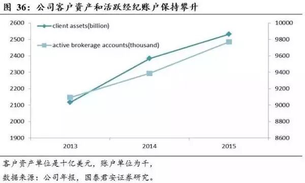 专注于开发中低收入客户,公司资管规模和账户数量在美国券商业影响力巨大。截止2015年年底,嘉信持有的客户总资产高达2.51万亿美元,活跃经纪账户为980万,公司退休计划客户150万,银行账户100万。公司下设投资服务和咨询服务两大部门,提供经纪、共同基金、ETF、咨询建议、银行、信托服务。