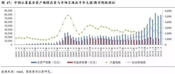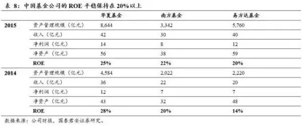 我们同时分析了中国基金行业,相关模式特征与美国同行一致。由于规模扩张不需要消耗资本,中国公募基金能保持“轻资产”运营模式,ROE水平更高,2014/15年,中国主要基金公司ROE在20%以上,而同期中国券商的ROE水平约10%(2014年)/15%(2015年)。有趣的是,中国公募基金存续规模表现出“牛市规模激增,熊市规模阴跌”的特征。即使在熊市,基金资产管理规模也可以保持较高的水平,这也许可以用行为金融解释,如基金投资者(大妈们)在产品七毛以下时常因心理账户、损失厌恶等原因不愿意赎回。这种策略下,中国公募基金的存量规模长期看可以保持稳定增长。