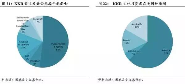 KKR已为全球PE/VC的巨头,资金渠道多元。从投资者角度看,KKR 2015年超过半数资金来自养老基金,其后便是金融机构。按地域分布看,KKR 2015年六成资金来自美洲,第二大资金来源地是亚太,占比约两成,来自欧洲的资金占15%。