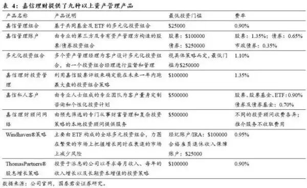 目前公司资产管理收入已经成为嘉信理财净利润的主要来源,占比高达41%。而在这一业务领域,嘉信理财优势在于对客户进行精细化管理,提供了九类基础资产管理产品,客户可根据自己的风险偏好及投资需求选择心仪的资产管理投资组合。产品差异化促进了管理费率保持了较高水平,即使考虑了货币市场基金、指数基金等被动型理财产品,公司资管业务费率总体在0.2%以上 。