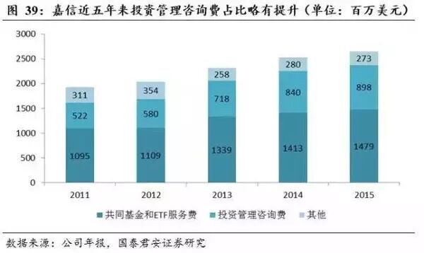 近年来虽然资产管理费率略有下降,但得益于资产规模的扩大,嘉信理财的资产管理收入仍然呈上升趋势。2015年嘉信资管收入为26.50亿美元,较2014年增长了5%。