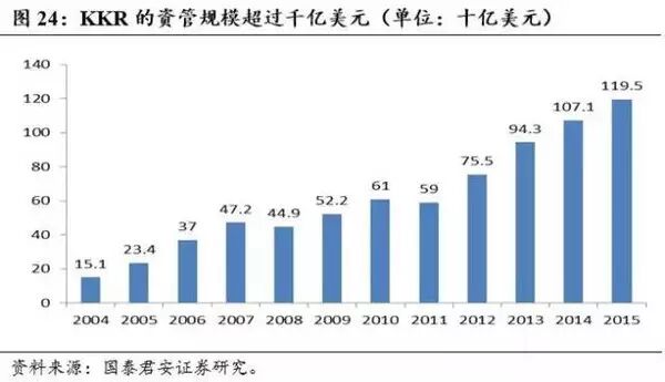 近十年来,KKR所管理的资产规模不断上升,从2004年的150亿美元增长到2015年的1195亿美元。AUM的增加来自于公司多年来为投资者创造出的丰厚回报,体现了投资者对于公司未来发展的充足信心。