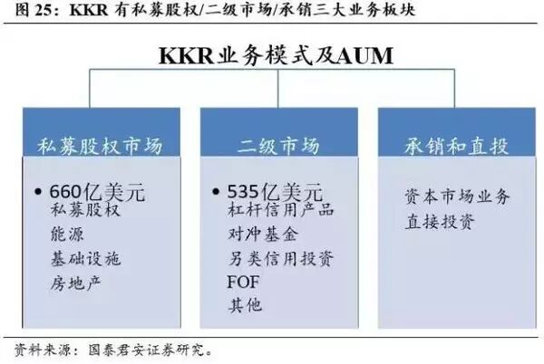 KKR的业务包括私募股权市场、二级市场以及承销与直投三个板块。私募股权市场下又设立了能源、基础设施和房地产的专项基金,截止2015年末,私募股权市场的AUM达到660亿美元。二级市场业务是2000年以后才陆续开展的,其管理资产规模已达到535亿美元,主要投资于杠杆信用产品、多空股票投资、另类信用投资及FOF等。此外,KKR还成立了承销部门和直投部门,目前管理资产大约50亿美元。