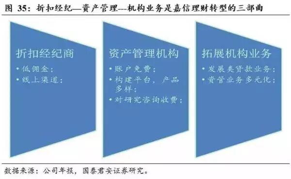 转型小结:嘉信在业务转型中,遵循了“折扣经纪—资产管理—机构业务”三部曲。第一步,公司业内率先降佣并开发网上渠道,这种以量补价的盈利方式帮助公司聚拢海量客户;第二步,公司聚焦于资产管理业务,通过多样产品和特色服务把公司打造成“资管平台”,战略由低成本转向差异化;第三步,公司向大学基金、养老金机构拓展资产管理业务,同时积极提升杠杆,开始做业务波动率较低的“类贷款”业务。经过多轮战略转型,嘉信理财初具全能投行的职能。