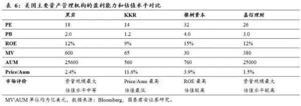 上文分析了海外资产管理的四类运营模式,我们同时比较了四类机构的盈利能力和估值水平。整体上,从盈利能力看,橡树资本最高(15%),其余三类保持在10%以上;从资管规模看,嘉欣理财和黑岩都可以管理2万亿美元规模,这与市值情况相一致,嘉欣理财和黑岩都可以成长为300亿美金的大市值机构,KKR和橡树市值在百亿元以内;从价值驱动看,KKR、橡树资本对资产端有控制能力,Price/Aum较高,而嘉欣理财主要做流量聚拢和资产配置,Price/Aum最低;从估值水平看,橡树资本和嘉欣理财估值水平较高,前者体现了资本市场对其针对不良债权定价能力(独特投资策略)的溢价,后者体现了聚拢流量、构建平台后的“护城河”价值,KKR的估值水平最低,这与公司有较多自营业务有关(成熟市场自营业务估值中枢1PB左右)。