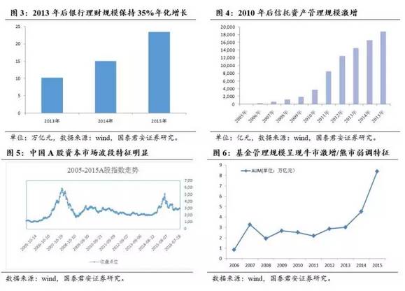 资管规模增长的驱动力在于:宏观经济稳增长带来的财富积累,人口老龄化促进向金融资产转移,互联网等带来的技术创新。同时监管政策环境下,银行等金融机构资产管理业务也在主动转型。根据银行团队的研究,目前银行理财业务与其说是赚取管理费的资产管理业务,不如说是表外的存贷款业务;当前监管导向下,未来银行有望设立资产管理子公司,回归资产管理业务本源,这会扩张资产管理业务规模。此外,全球有近10万亿元以上资产处于负利率环境中,波动率加大,资金的全球配置需求也在显著提升。