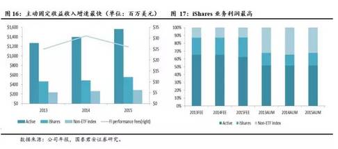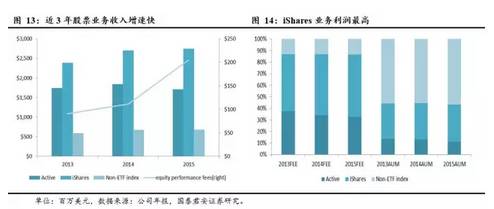 2013-2015年,股票的业绩收入上升明显,由9100万美元升至2.05亿美元。主动管理组合收入较为稳定,略有下降;iShares(股票ETF)组合收益逐年上升,且收入占比最高,约占50%;非ETF指数型组合收入稳定,占比约为10%,但其AUM超过50%。公司的iShares是公司的明星业务,体量大,且管理费低,相较于非ETF指数型基金有较多的优势。