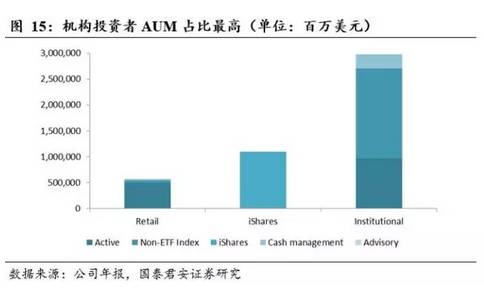 2015年公司权益投资中,机构客户AUM约为2.7万亿美元,占比最高,且主要是非ETF指数型投资,其次是积极管理型;零售客户AUM约为5411万美元,占比最低,其中主动型投资占比最高;iShares投资中包含零售和机构客户,投资金额约为1.09万亿美元。
