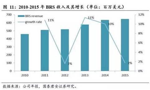 BRS 2015年收入为6.4亿美元,同期增长2%,占公司总收入的5.6%。Aladdin占BRS收入比82%,其主要收入来源是长期的合同收入。由图1可知,BRS收入逐年上升,除了2012和2015年收入增长较慢以外,最近五年的收入增长达到10%左右。