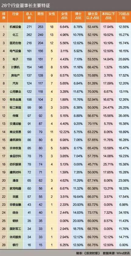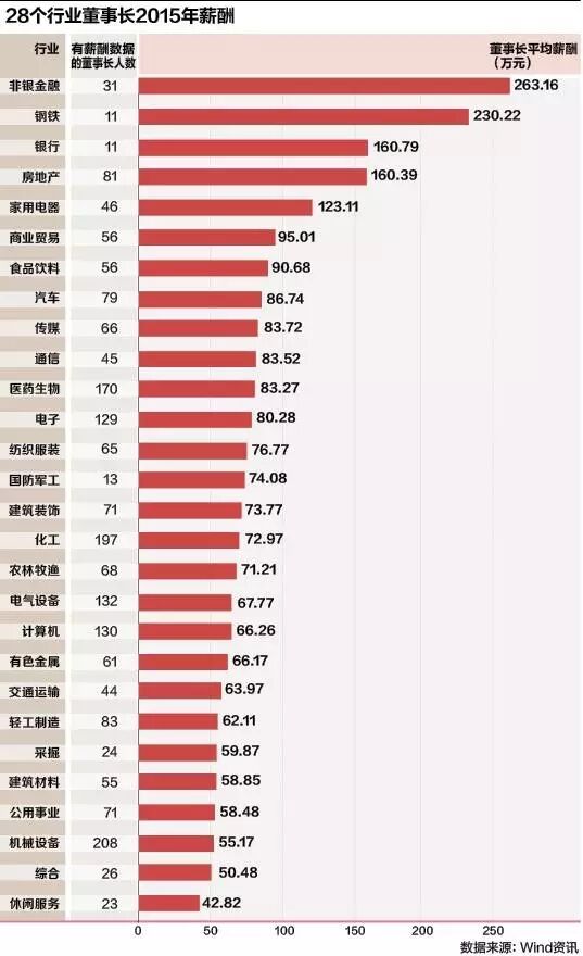28个行业中,董事长平均薪酬排名前三的分别是非银金融、钢铁和银行,分别为263.16万元、230.22万元和160.79万元。