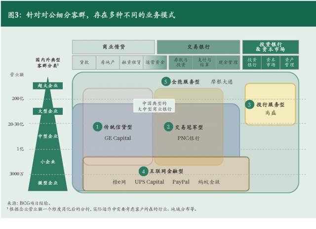 1.展望五大发展趋势 1.1 增速放缓、结构变化的收入池 公司银行业务是传统银行业务中的基石,其资产、收入、利润贡献都达到行业的一半。聚焦中国银行业收入池,预计银行业总体收入将从2015年的4.7万亿元人民币上升至2020年的7.7万亿元人民币,年均复合增速10.5%。其中,受到中国经济结构调整、多层次资本市场发展和企业“去杠杆”等多方面的影响,公司银行业务收入占比预计将从2015年的47%微降至2020年的46%;绝对值预计从2015年的2.2万亿元人民币上升至2020年的3.5万亿元人民币。公司银行仍为整个银行业的第一大收入来源,增长主要来自中型、小型企业客户,以及交易银行、投资银行等业务。 从客群角度看,预计到2020年,超大企业为公司银行业务贡献收入为2500亿元人民币,占比7%;大型企业收入6300亿元人民币,占比18%;中型企业收入1.23万亿元人民币,占比34%,小微企业贡献收入7100亿元人民币,占比20%;此外,财政及机关团体贡献收入7600亿元人民币,占比21%。其中,增速最快的为中型企业和小微企业,预计2015-2020年均增长率分别为11%和14%;而超大企业和财政及机关团体的增速放缓,预计增长率约为8%-9%(参阅图1)。 从产品角度看,受全球低利率环境、中国利率市场化、金融脱媒等影响,传统存贷业务增长放缓,对收入的贡献预计将从2015年的57%下降至2020年的52%,交易银行、投资银行的收入贡献预计分别从2015年的13%和4%上升至2020年的14%和6%,成为公司银行业务主要的增长点。除此之外,资产管理、金融市场等业务的收入贡献也将稳步提升(参阅图2)。 尽管面临总体增速放缓以及业务结构调整,公司银行业务仍是银行业的基石。公司银行业务的健康发展对每一家商业银行来说都是关系生存的头等大事,因此需要准确把握公司银行业务未来的发展趋势,打造差异化的业务模式,转型基础能力。在中国,严峻的宏观经济新常态、挑战的金融市场环境、分化的公司客户需求、强劲的科技创新机遇将是塑造公司银行业务转型的关键要素。 1.2 转型中的宏观经济新常态 宏观经济增速整体放缓。根据国家统计局公布的数据,2015年我国GDP同比增长6.9%,25年来首次降至7%以下。2016年一季度GDP增速6.7%,全年预计在6.5%-7%之间。其中,受全球需求疲软、人民币升值、劳动力成本上升等因素的影响,净出口对GDP的贡献持续下降;房地产、制造业、基础设施建设领域的固定投资累计增速从2011年6月开始持续下滑,至2015年底仅为30%左右,且企业投资意愿持续低靡。“三驾马车”对经济增长的拉动日渐乏力。 宏观经济的L型和结构性调整将改变银行业的普涨格局,加剧银行业内部的分化。此外,新型城镇化、一带一路、地方债置换、房地产理性调控,以及跨境商务和海外投资带来的全球化需求,都将从根本上重塑公司银行的发展机遇和重点。 1.3 严峻的金融市场环境 首先,商业银行存量信贷不良率持续攀升。 其次,增量业务面临企业“去杠杆”压力。 第三,金融脱媒不断加速。 第四,价格市场化持续深化。 1.4 分化的对公客户需求 结合BCG在全球的经验,我们建议银行以企业的营业收入作为划分对公客群的第一道标准,同时参考所在行业、资产规模、授信规模、对银行的资源消耗等维度,综合进行客户划分。不同类型的公司客户,其特点和需求存在较大的差异。 第一,超大企业:营业收入超过200亿元人民币。超大企业往往具有全国化甚至全球化布局、多元化业务和集团化经营的特征。它们是各个行业中的市场领导者,并购是超大企业快速实现业务布局的主要手段。超大企业的金融需求成熟,并于近几年全方位涉足债权、股权和专业金融等直接融资领域。另外,超大企业普遍在集团内下设财务公司或持有金融机构股份,具有类似金融机构的能力,因此对银行及其他机构的金融服务能力要求极高。 第二,大型企业:营业收入30亿元至200亿元人民币。从全球来看,30亿元人民币(约5亿美元)通常是区分大型企业和中型企业的分割线。超过30亿元人民币营业收入的大型企业,往往具备跨省集团化经营的特征,并购是其常见的扩张手段。大型企业对融资的需求较为迫切,希望银行或券商机构在行业领域具有专业知识及针对性的解决方案。另外,大型企业的合作银行数量较多,因此希望得到优质的专属服务。 第三,中型企业:营业收入1亿元至30亿元人民币。随着业务规模和地域覆盖的不断扩大,中型企业的金融需求呈现出复杂化的趋势。除对现金管理、支付结算具有强烈需求外,中型企业对融资的要求也日益多样化。例如,部分信用优质的中型企业会尝试通过直接融资获取所需资金。相比大型、超大企业,中型企业的金融需求往往由1-2家股份制银行、或城商行即可满足。 第四,小微企业:营业收入小于1亿元人民币。其业务处于起步阶段,金融需求简单,大部分为传统的信贷产品。另外小微企业主本人也有财富管理需求。小微企业与银行的合作通常由私人关系或地理位置等因素所决定。 传统公司银行业务主要关注成长、成熟期的大型、超大型客户。未来,公司银行客户将会向全周期转变。除成长、成熟期企业外,大量初创期小微企业、转型期 “问题”企业也会成为重要的潜在客户,要求公司银行具备灵活响应客户需求、综合运用各种金融工具的能力。 1.5 强劲的科技创新机遇 科技浪潮正在席卷银行业,许多从业者已经充分认识