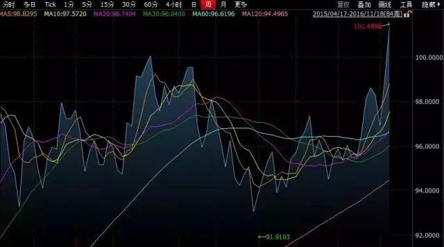 大选当日(9日),美元指数先是一路下挫,跌至95.8832,然后来个触底反弹,最终大幅收涨。此后,美元便一路高歌猛进,18日更是站上最高点101.4896。