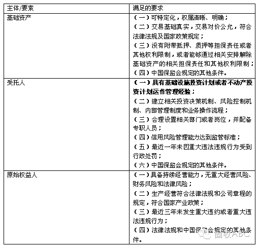 谈到保监系统ABS的发展,首先要提到的是保监会于2015年8月份发布的《资产支持计划业务管理暂行办法》(以下简称“《办法》”),《办法》对基础资产、受托人、原始权益人的要求都做了说明: