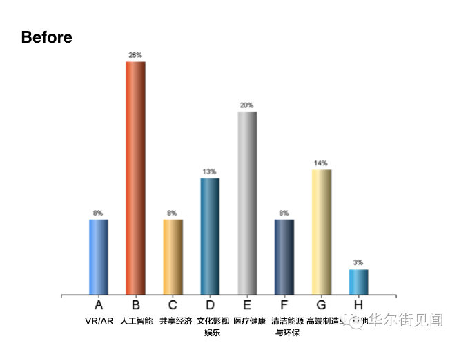 但在听了嘉宾们的分享之后,大家的偏好明显发生了一些微妙的转变,需求池巨大的医疗健康领域开始为1/3投资者看好,人工智能的比重较之前明显下滑。