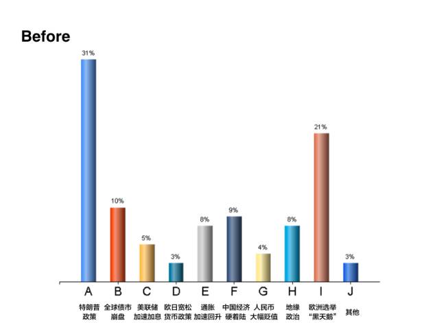 这一番话果然把现场的投资者吓坏了,大家纷纷拿起投票器,不安地把欧洲选举列为2017全球市场首当其冲的“黑天鹅”。
