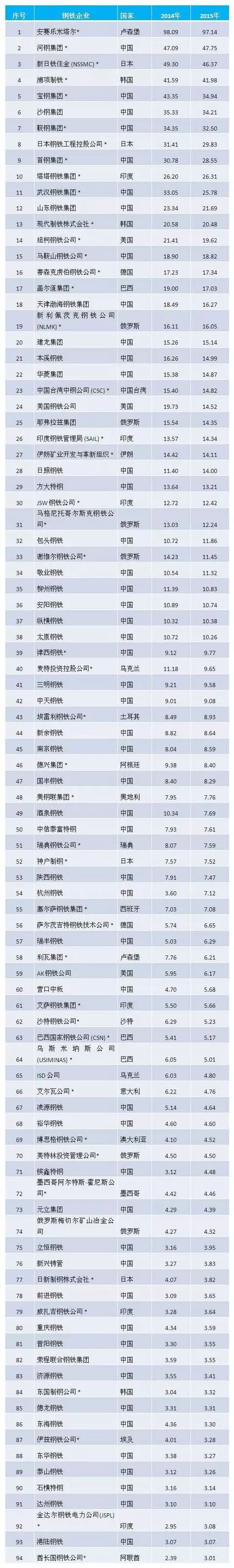 世界钢铁协会发布的全球主要钢铁生产公司产量数据显示:全球粗刚生产超过300万吨的钢铁企业94家,其中中国企业达到50家,占企业总数量的53.2%。