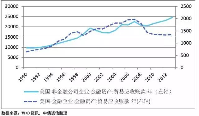 以美国为例,在1990年之后金融企业与非金融企业金融资产中的贸易应收款随着经济发展均持续增长。金融企业在1997年亚洲金融危机时出现了一个小幅震荡后继续增长。而2007年国际金融危机的爆发,整体经济趋势的下滑,金融企业与非金融企业金融资产中的贸易应收款均出现了下滑,非金融企业的贸易应收款在2010年左右随着经济的复苏则开始逐步回升,并超过了前期水准。而金融企业的贸易应收款则在较大幅度下降之后,一直维持在低点附近,并未有明显的复苏迹象。可见,相对于金融企业,贸易应收款是非金融企业经营活动的一个重要组成部分,尽管受到金融危机的影响,但随着经济的复苏,贸易应收款的规模也随之扩大